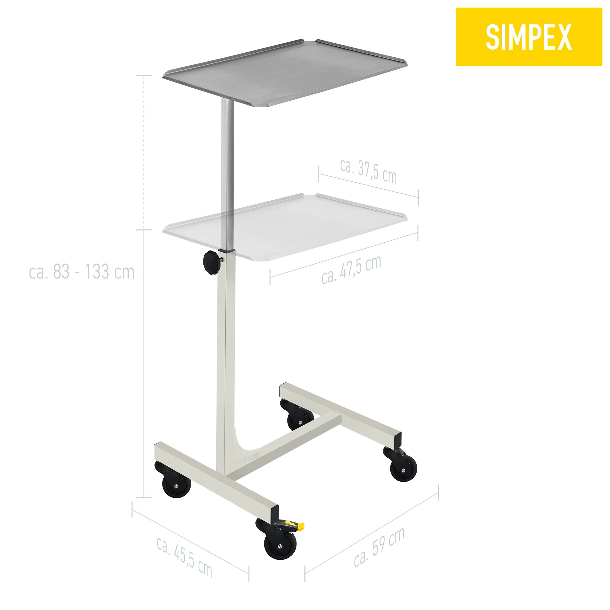 Mit einer Tragkraft von bis zu 12 kg bietet der Instrumententisch MAYO-SERVE eine hohe Belastung im Arbeitsalltag. Variabel in der Gestelloberfläche und im Fußgestell kann die Höhe des Tisches mit Hilfe eines Handrads auf die benötigte Höhe stufenllos verstellt werden.