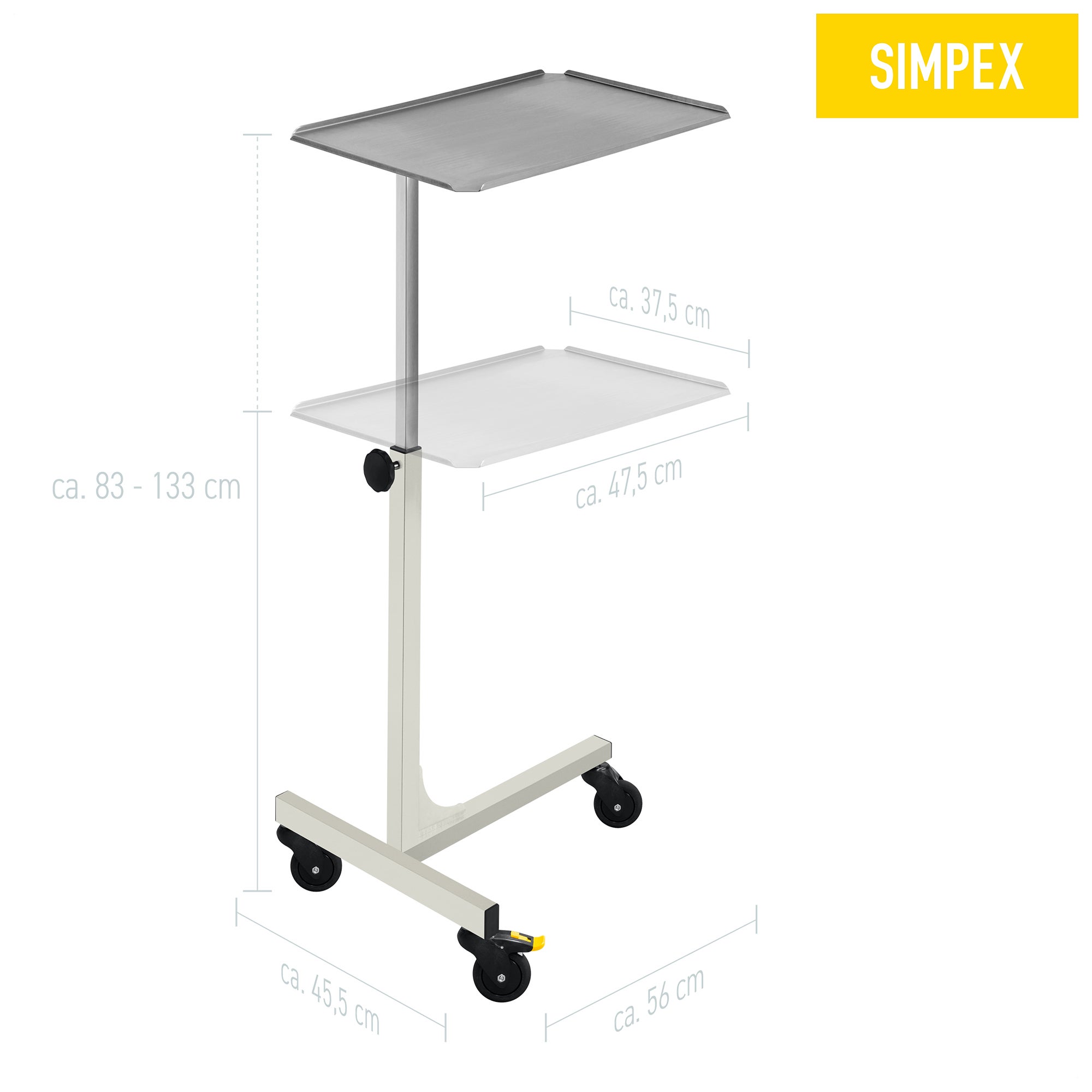 Mit einer Tragkraft von bis zu 12 kg bietet der Instrumententisch MAYO-SERVE eine hohe Belastung im Arbeitsalltag. Variabel in der Gestelloberfläche und im Fußgestell kann die Höhe des Tisches mit Hilfe eines Handrads auf die benötigte Höhe stufenllos verstellt werden.