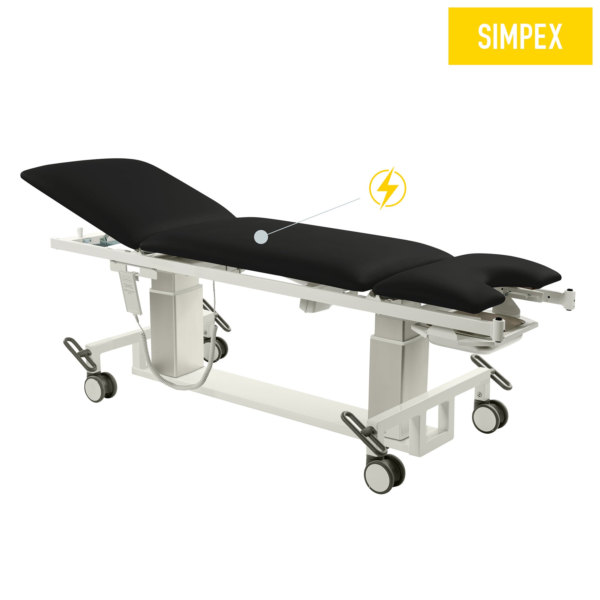 Das dreigeteilte Komfort-Wechselpolster in Standard-Qualität (70 mm / 40 kg/m³) macht diese elektrische Liege mit einer Tragkraft von 400 kg zum Allrounder im Selection-Bereich. Durch einen Hand- oder Fußauslöser (optional) können die zwei Hubsäulen durch die Neigung der Liegeflächen eine optimale Beckenkippung (+36°) für die Untersuchung erreichen. Dank der elektrisch verstellbaren Hubsäulen kann ebenso in schnellen Handgriffen eine Trendelenburglagerung erreicht werden. Der Bezug aus flammhemmendem und desinfizierbarem Kunstleder in 12 verschiedenen Farben sorgt für hohe Lebensdauer.